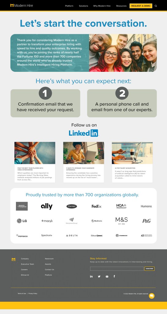 Modern Hire launched their new website in 2022. The goal was to align the site with the new visual brand, elevate the user experience and increase demand generation. My role was to design and support page layout and content.